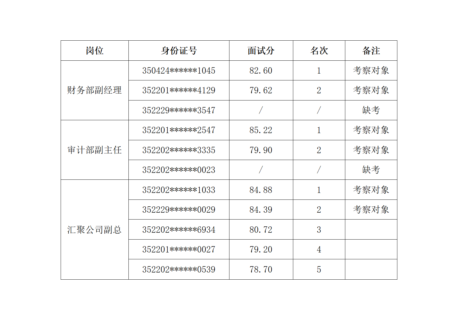 根据《中层管理人员竞争上岗方案》及相关要求,,,,,,,现将考生面试成绩向予以公示。。。。。。。根据面试成绩从高到低,,,,,,,按2:1的比例确定考察对象。。。。。。。